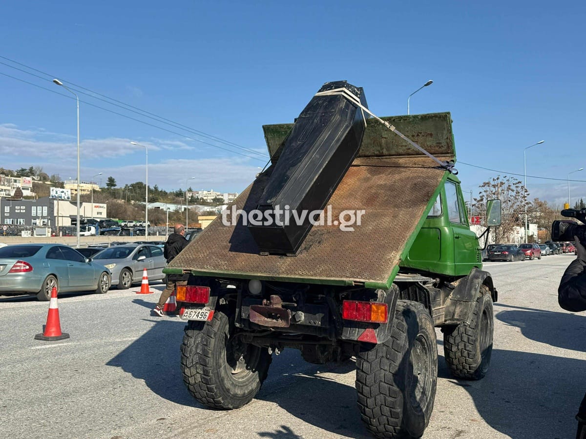 Μάλιστα οι αγρότες στο Δερβένι έχουν τοποθετήσει ένα φέρετρο σε αγροτικό μηχάνημα ενώ κρατούν και στεφάνι κηδείας, θέλοντας με αυτόν τον τρόπο να τονίσουν πως “η αγροτιά πεθαίνει”.