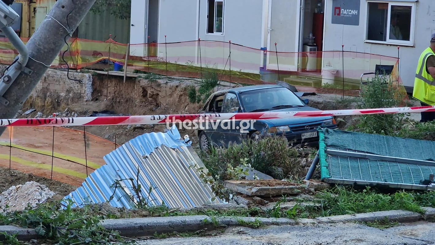Λόγω της υποχώρησης του οδοστρώματος, τα παρκαρισμένα οχήματα στην άκρη της οδού Αλοννήσου κρεμόντουσαν στον αέρα ενώ ένα έπεσε μέσα στο εργοτάξιο!
