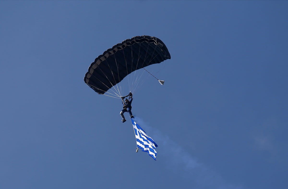 Σε ελεύθερη πτώση, από ύψος 2.000 μέτρων όπου ίπταντο στο ελικόπτερο Χιούι, ο αρχιλοχίας Γιώργος Κουτσογιάννης και ο υπολοχαγός Κώστας Μπίστας έπεσαν και προσγειώθηκαν μπροστά στην εξέδρα των επισήμων και την Πρόεδρο της Δημοκρατίας Κατερίνας Σακελλαροπούλου.