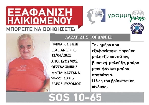 Ο Λαζαρίδης Ιορδάνης, 63 ετών, την 12/04/21 εξαφανίστηκε από το σπίτι του, στον Εύοσμο, Θεσσαλονίκης, όταν βγήκε για να κάνει την καθιερωμένη του μεσημεριανή βόλτα . Έχει καστανά μάτια, ύψος 1,73μ και είναι εύσωμος.