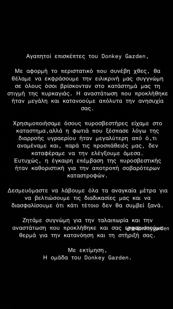 Το καφέ-μπαρ στη Θεσσαλονίκη στο οποίο ξέσπασε φωτιά το Σάββατο από διαρροή υγραερίου σε θερμάστρα, εξέδωσε ανακοίνωση θέλοντας να ζητήσει “συγγνώμη” από τους πελάτες του.