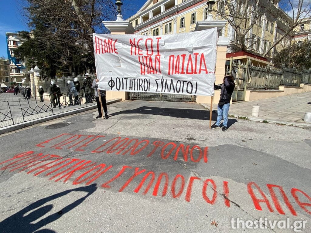 «Είστε δολοφόνοι», έγραψαν μπροστά στο ΥΜΑΘ φοιτητικοί σύλλογοι που συμμετείχαν στη σημερινή κινητοποίηση.