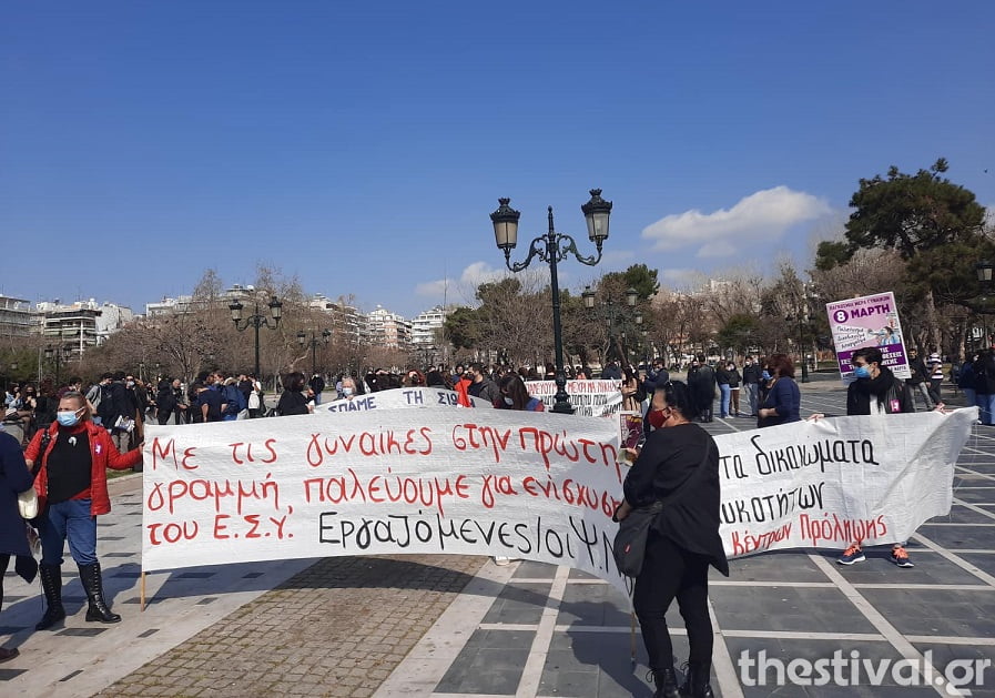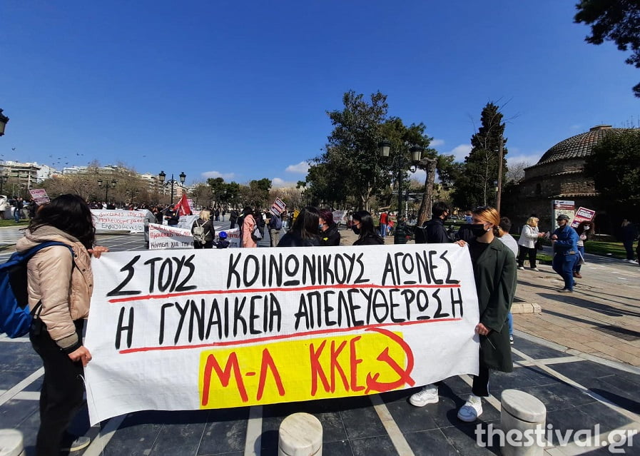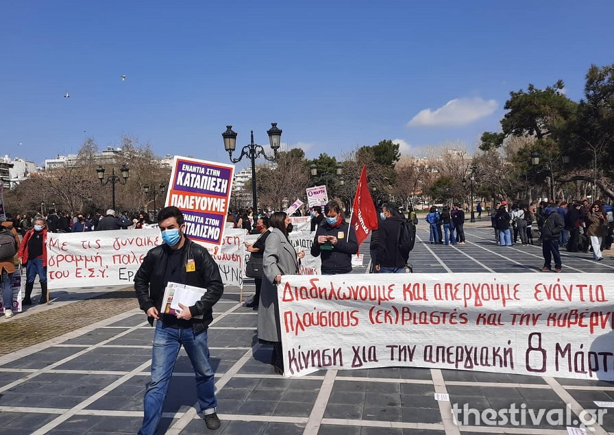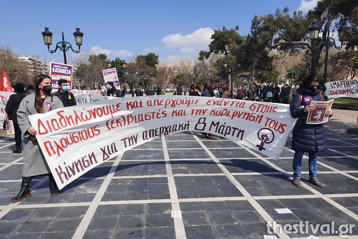 Συγκέντρωση διαμαρτυρίας, με αφορμή την Παγκόσμια Ημέρα της Γυναίκας, πραγματοποιούν αυτή την ώρα μέλη φεμινιστικών οργανώσεων, γυναικείων συλλογικοτήτων, συνδικαλιστικών ενώσεων, φοιτητικών συλλόγων και εργατικών σωματείων πραγματοποιούν στο άγαλμα Βενιζέλου, στη Θεσσαλονίκη.