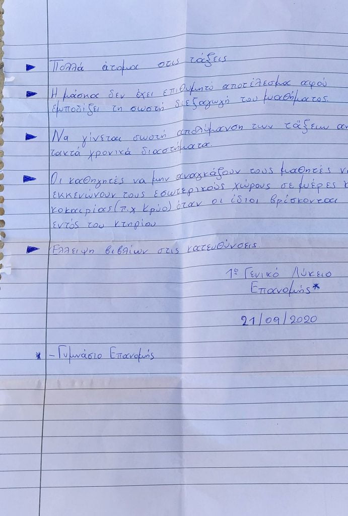 Ακόμα αναφέρουν ότι υπάρχουν πολλοί μαθητές στις τάξει, ενώ ζητούν σωστή απολύμανση των χωρών του σχολείου σε τακτά χρονικά διαστήματα.