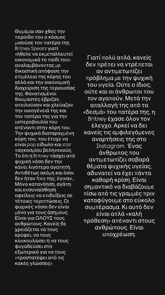 Γιατί πολύ απλά, κανείς δεν πρέπει να ντρέπεται αν αντιμετωπίζει πρόβλημα με την ψυχική του υγεία. Ούτε ο ίδιος, ούτε και οι άνθρωποι που τον αγαπούν. Μετά την απαλλαγή της από τα “δεσμά” του πατέρα της, η Britney έχασε όλον τον έλεγχο. Αρκεί να δει κανείς τις αμφιλεγόμενες αναρτήσεις της στο Instagram. Ένας άνθρωπος που αντιμετωπίζει σοβαρά θέματα ψυχικής υγείας, αδυνατεί να έχει πάντα καθαρή κρίση. Είναι σημαντικό να διαβάζουμε πίσω από τις γραμμές πριν καταφύγουμε στο εύκολο συμπέρασμα. Κι αυτό δεν είναι απλά “καλή πρόθεση” απέναντι στους ανθρώπους. Είναι υποχρέωση», έγραψε η Δέσποινα Καμπούρη.
