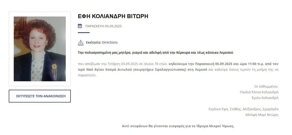 Σύμφωνα με το post, η κηδεία έγινε πριν από λίγο και πιο συγκεκριμένα στον Ιερό Ναό Αγίου Κοσμά Αιτωλού (κοιμητήριο Σφαλαγγιώτισσας) στη Λεμεσό Κύπρου. Αντί στεφάνων, η οικογένεια ζήτησε να γίνουν εισφορές για το Ίδρυμα Μικροί Ήρωες.