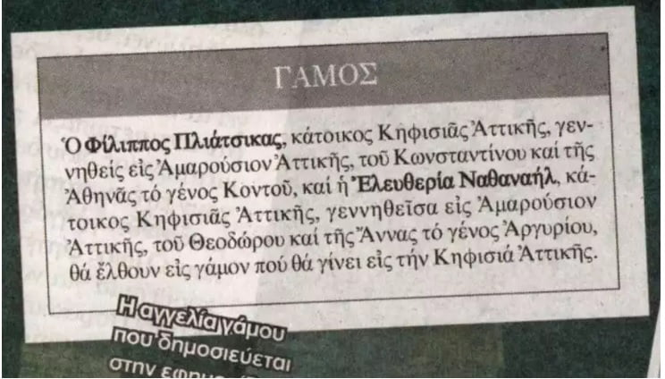 Η αναγγελία του γάμου τους, που δημοσιεύτηκε στην εφημερίδα Εστία, αναφέρει πως το μυστήριο θα τελεστεί στην Κηφισιά, χωρίς ωστόσο να δίνεται ακριβής ημερομηνίας.