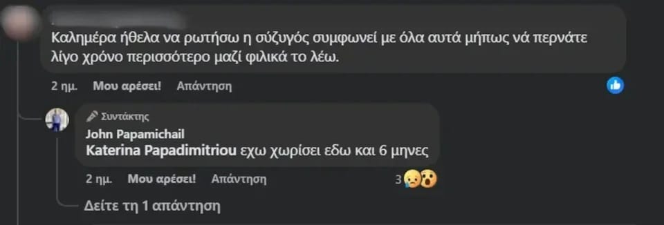 Πιο συγκεκριμένα, σε μια από τις αναρτήσεις του στο Facebook, μια γυναίκα σχολίασε: «Καλημέρα ήθελα να ρωτήσω, η σύζυγος συμφωνεί με όλα αυτά μήπως να περνάτε λίγο χρόνο περισσότερο μαζί; Φιλικά το λέω» με τον ίδιο να απαντά: «Έχω χωρίσει εδώ και έξι μήνες».
