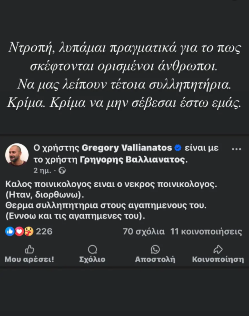 Μετά τις έντονες αντιδράσεις που προκάλεσε η ανάρτησή του για τον Αλέξη Κούγια, καθώς και το δημόσιο ξέσπασμα του γιου του γνωστού ποινικολόγου που έφυγε από τη ζωή, ο Γρηγόρης Βαλλιανάτος επανήλθε με νέα δημοσίευση.