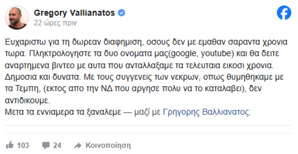 Συγκεκριμένα, στον προσωπικό του λογαριασμό στο Facebook έγραψε: «Ευχαριστώ για τη δωρεάν διαφήμιση, όσους δεν με έμαθαν σαράντα χρόνια τώρα. Πληκτρολογήστε τα δυο ονόματά μας (Google, YouTube) και θα δείτε αναρτημένα βίντεο με αυτά που ανταλλάξαμε τα τελευταία είκοσι χρόνια. Δημόσια και δυνατά. Με τους συγγενείς των νεκρών, όπως θυμηθήκαμε με τα Τέμπη, (εκτός από τη ΝΔ που άργησε πολύ να το καταλάβει), δεν αντιδικούμε. Μετά τα εννιάμερα τα ξαναλέμε».