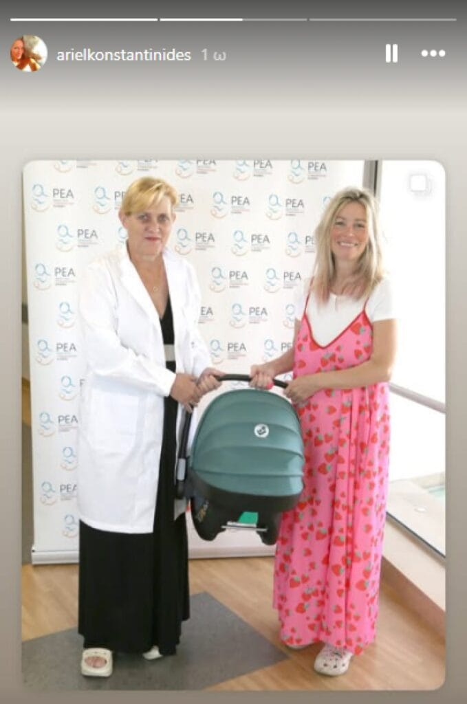 Η Άριελ Κωνσταντινίδη φωτογραφήθηκε χαμογελαστή, μαζί με τη γιατρό της, φορώντας ένα ροζ φόρεμα με φράουλες, ενώ κρατούσε το πορτ-μπεμπέ με την κόρη της.