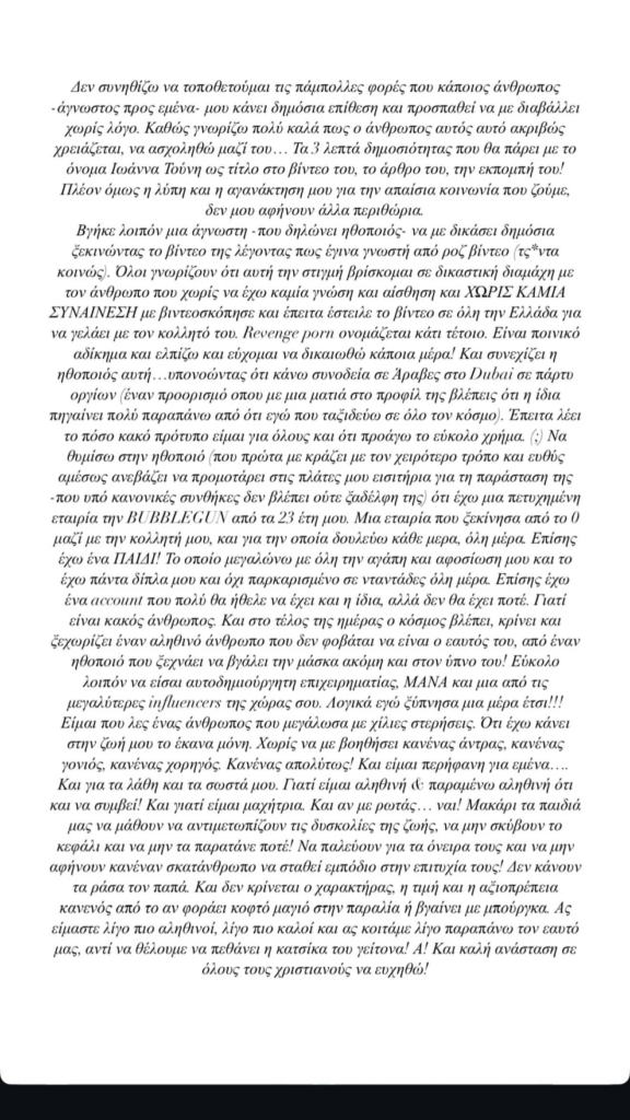 Βγήκε λοιπόν μια άγνωστη -που δηλώνει ηθοποιός- να με δικάσει δημόσια ξεκινώντας το βίντεο της λέγοντας πως έγινα γνωστή από ροζ βίντεο (τσ@@@ κοινώς). Όλοι γνωρίζουν ότι αυτή την στιγμή βρίσκομαι σε δικαστική διαμάχη με τον άνθρωπο που χωρίς να έχω καμία γνώση και αίσθηση και ΧΩΡΙΣ ΚΑΜΙΑ ΣΥΝΑΙΝΕΣΗ με βιντεοσκόπησε και έπειτα έστειλε το βίντεο σε όλη την Ελλάδα για να γελάει με τον κολλητό του. Revenge Porn ονομάζεται κάτι τέτοιο.
