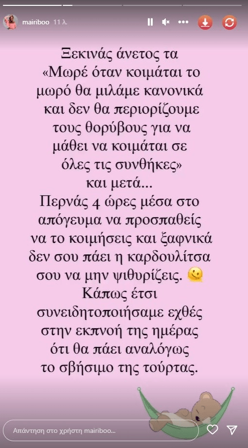 Στη συνέχεια, η ίδια κοινοποίησε κάποια instastories από τη στιγμή που σβήνει χαμηλόφωνα τα κεράκια της, ενώ αποκάλυψε και την ιδιαίτερη ευχή που έκανε φέτος. Αυτή δεν ήταν άλλη, από το μην έχει το παιδάκι της κολικούς!
