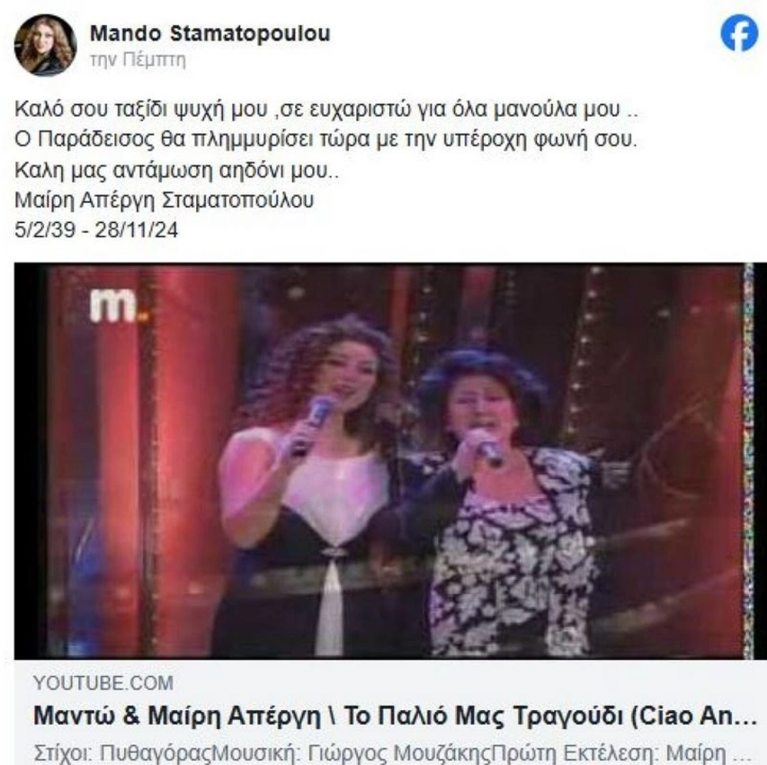 Στη λεζάντα της δημοσίευσής της, η Μαντώ έγραψε: «Καλό σου ταξίδι ψυχή μου, Σε ευχαριστώ για όλα μανούλα μου. Ο Παράδεισος θα πλημμυρίσει τώρα με την υπέροχη φωνή σου. Καλή μας αντάμωση αηδόνι μου».