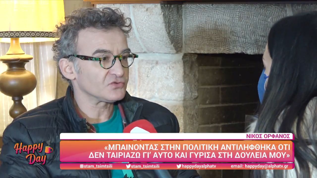 Στην κάμερα του Happy Day μίλησε ο Νίκος Ορφανός με αφορμή τη συμμετοχή του στη νέα σειρά του Alpha. Μεταξύ άλλων, ο γνωστός ηθοποιός αναφέρθηκε στην ενασχόληση του με την πολιτική καθώς και την άσχημη συνεργασία που είχε με σκηνοθέτη στο παρελθόν.