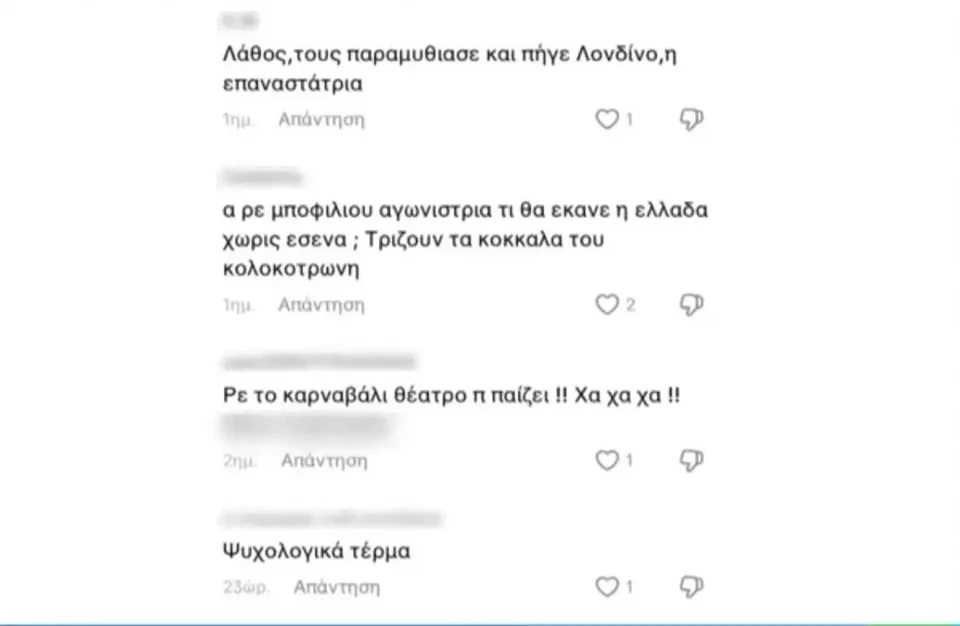 «Με φόρεμα 2.000 ευρώ τσακίζεται ο φασισμός. Τους πνίγεις τους φασίστες με μετάξι και σατέν», είναι ένα από τα χαρακτηριστικότερα σχόλια, με αρκετούς να κάνουν αναφορές και σε παλαιότερο ταξίδι της στο Λονδίνο.