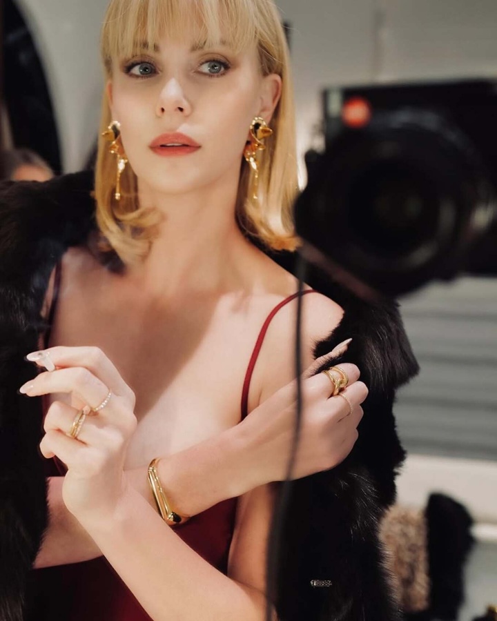 Ολοκλήρωσε την εμφάνισή της με χρυσά σκουλαρίκια, ενώ και τα μαλλιά της είναι κομμένα σε ένα κοντό καρέ, που θυμίζει τον ρόλο της «Ελβίρα», την οποία υποδύθηκε η Μισέλ Φάιφερ στην ταινία του Μπράιαν Ντε Πάλμα.
