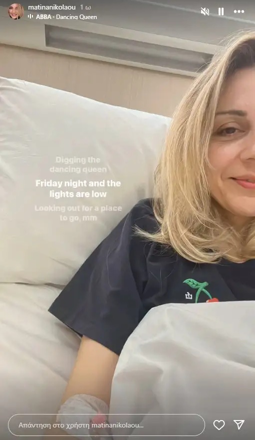 Η Ματίνα Νικολάου δημοσίευσε φωτογραφία της από το κρεβάτι του νοσοκομείου, με τον ορό στο χέρι της. Η ίδια δεν θέλησε να κάνει καμία αναφορά σχετικά με το θέμα της υγείας της, ωστόσο πρόσθεσε στην ανάρτησή της την μεγάλη επιτυχία των ABBA, «Dancing Queen»,
