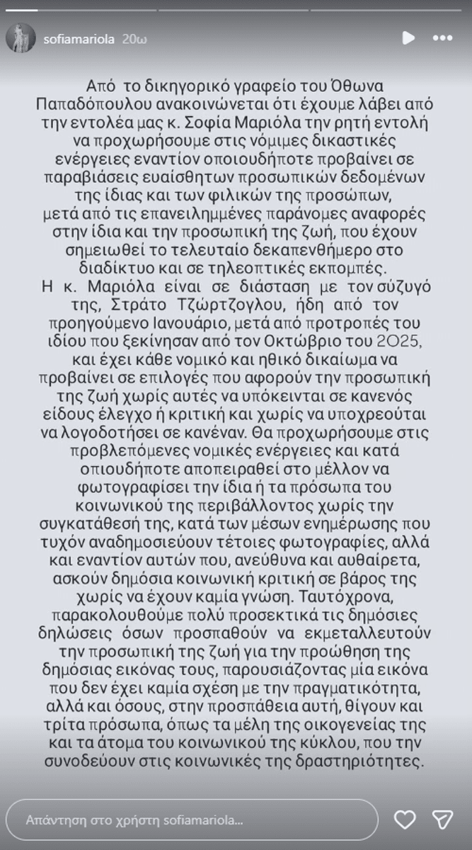 Η κ. Μαριόλα είναι σε διάσταση με τον σύζυγό της, Στράτο Τζώρτζογλου, ήδη από τον προηγούμενο Ιανουάριο, μετά από προτροπές του ιδίου που ξεκίνησαν από τον Οκτώβριο του 2025, και έχει κάθε νομικό και ηθικό δικαίωμα να προβαίνει σε επιλογές που αφορούν την προσωπική της ζωή χωρίς αυτές να υπόκεινται σε κανενός είδους έλεγχο ή κριτική και χωρίς να υποχρεούται να λογοδοτήσει σε κανέναν.