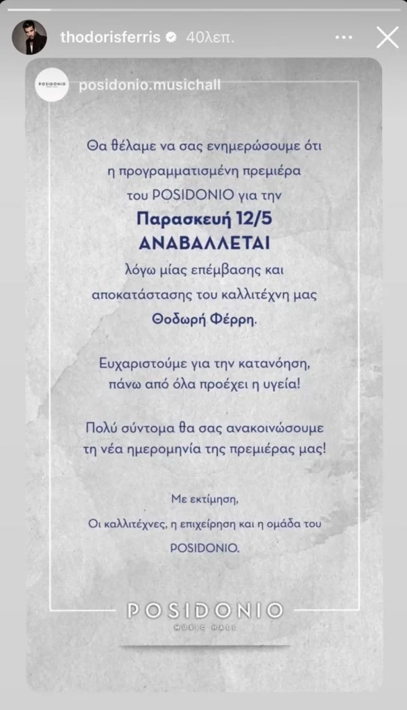 «Θα θέλαμε να σας ενημερώσουμε ότι η προγραμματισμένη πρεμιέρα για την Παρασκευή 12/5 αναβάλλεται λόγω μίας επέμβασης και αποκατάστασης του καλλιτέχνη μας Θοδωρή Φέρρη. Ευχαριστούμε για την κατανόηση, πάνω από όλα προέχει η υγεία! Πολύ σύντομα θα σας ανακοινώσουμε τη νέα ημερομηνία της πρεμιέρας μας!», αναφέρει χαρακτηριστικά η ανάρτηση.