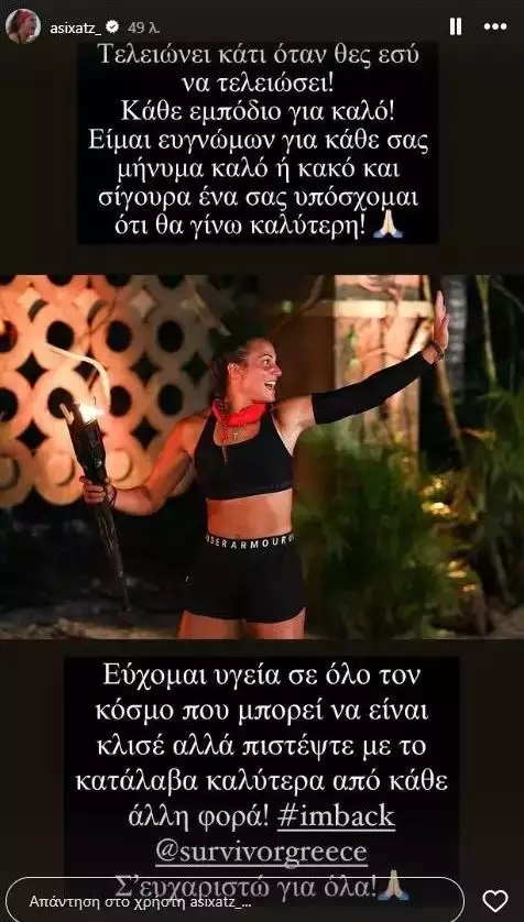 Ασημίνα Χατζηανδρέου – Η πρώτη της ανάρτηση μετά την αποχώρησή της από το Survivor: “Κάθε εμπόδιο για καλό”