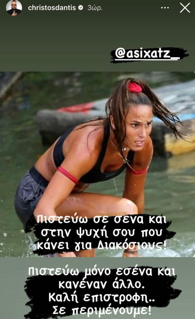 «Πιστεύω σε σένα και στην ψυχή σου που κάνει για διακόσιους. Πιστεύω μόνο εσένα και κανέναν άλλον. Καλή επιστροφή, σε περιμένουμε» έγραψε ο Χρήστος Δάντης, δημοσιεύοντας μια φωτογραφία της Ασημίνας Χατζηανδρέου.