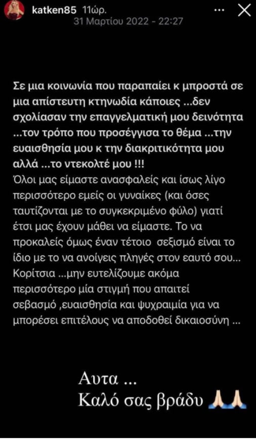 Όλοι μας είμαστε ανασφαλείς και ίσως λίγο περισσότερο εμείς οι γυναίκες και όσες ταυτίζονται με το συγκεκριμένο φύλο γιατί έτσι μας έχουν μάθει να είμαστε. Το να προκαλείς έναν τέτοιο σεξισμό είναι το ίδιο με το να ανοίγεις πληγές στον εαυτό σου. Κορίτσια, μην ευτελίζουμε ακόμα περισσότερο μια στιγμή που απαιτεί σεβασμό, ευαισθησία και ψυχραιμία για να μπορέσει επιτέλους να αποδοθεί δικαιοσύνη».