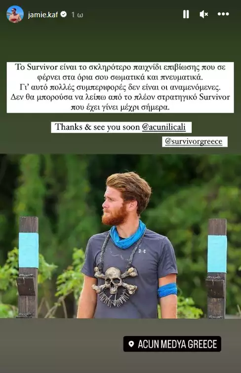 Ειδικότερα, μέσα από τον προσωπικό του λογαριασμό στο Instagram, ο Τζέιμς Καφετζής επέλεξε να δημοσιεύσει μια ιστορία στην οποία και έγραψε χαρακτηριστικα τα εξής. «Το Survivor είναι το σκληρότερο παιχνίδι επιβίωσης που σε φέρνει στα όρια σου σωματικά και πνευματικά. Για αυτό πολλές φορές συμπεριφορές δεν είναι οι αναμενόμενες. Δεν θα μπορούσα να λείπω από το πλέον στρατηγικό Survivor που έχει γίνει μέχρι σήμερα»