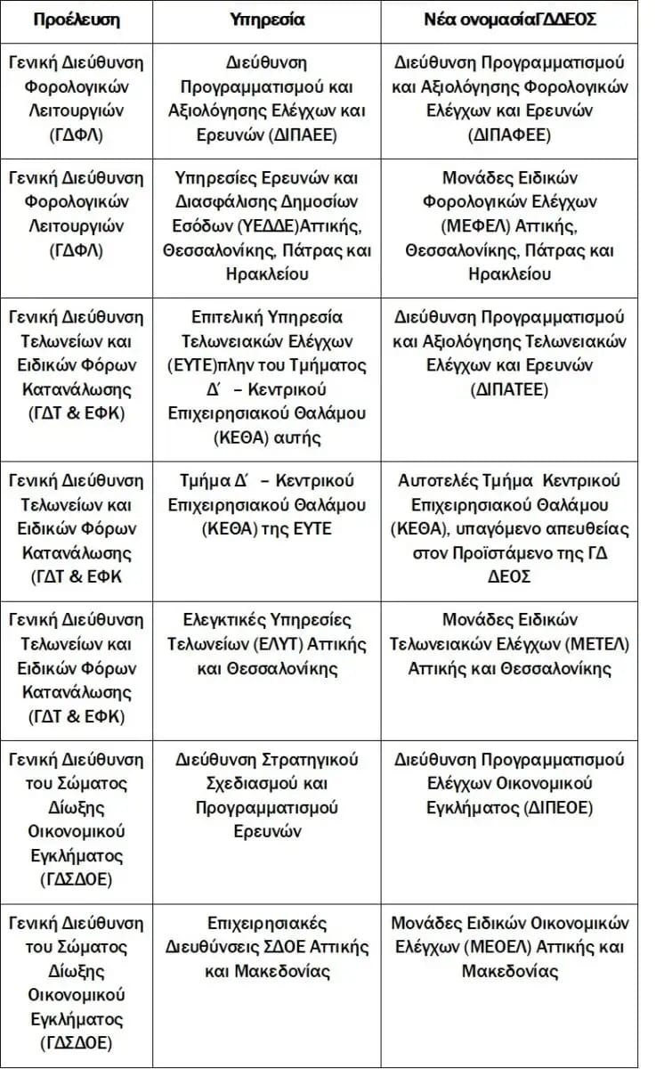 Η νέα Γενική Διεύθυνση προκύπτει από τη μετεξέλιξη της μέχρι σήμερα Γενικής Διεύθυνσης του Σώματος Δίωξης Οικονομικού Εγκλήματος (ΓΔΣΔΟΕ) και ενισχύεται σημαντικά με τη μεταφορά σε αυτή ελεγκτικών μονάδων από τη Γενική Διεύθυνση Φορολογικών Λειτουργιών (ΓΔΦΛ) και τη Γενική Διεύθυνση Τελωνείων και Ειδικών Φόρων Κατανάλωσης (ΓΔΤ & ΕΦΚ), όπως αποτυπώνεται στον ακόλουθο πίνακα: