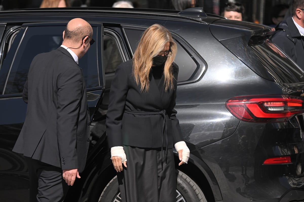 Η Μαρέβα Γκραμπόσφκι με επιδέσμους στα χέρια και μάσκα, στην κηδεία της Ελένης Γλύκατζη-Αρβελέρ