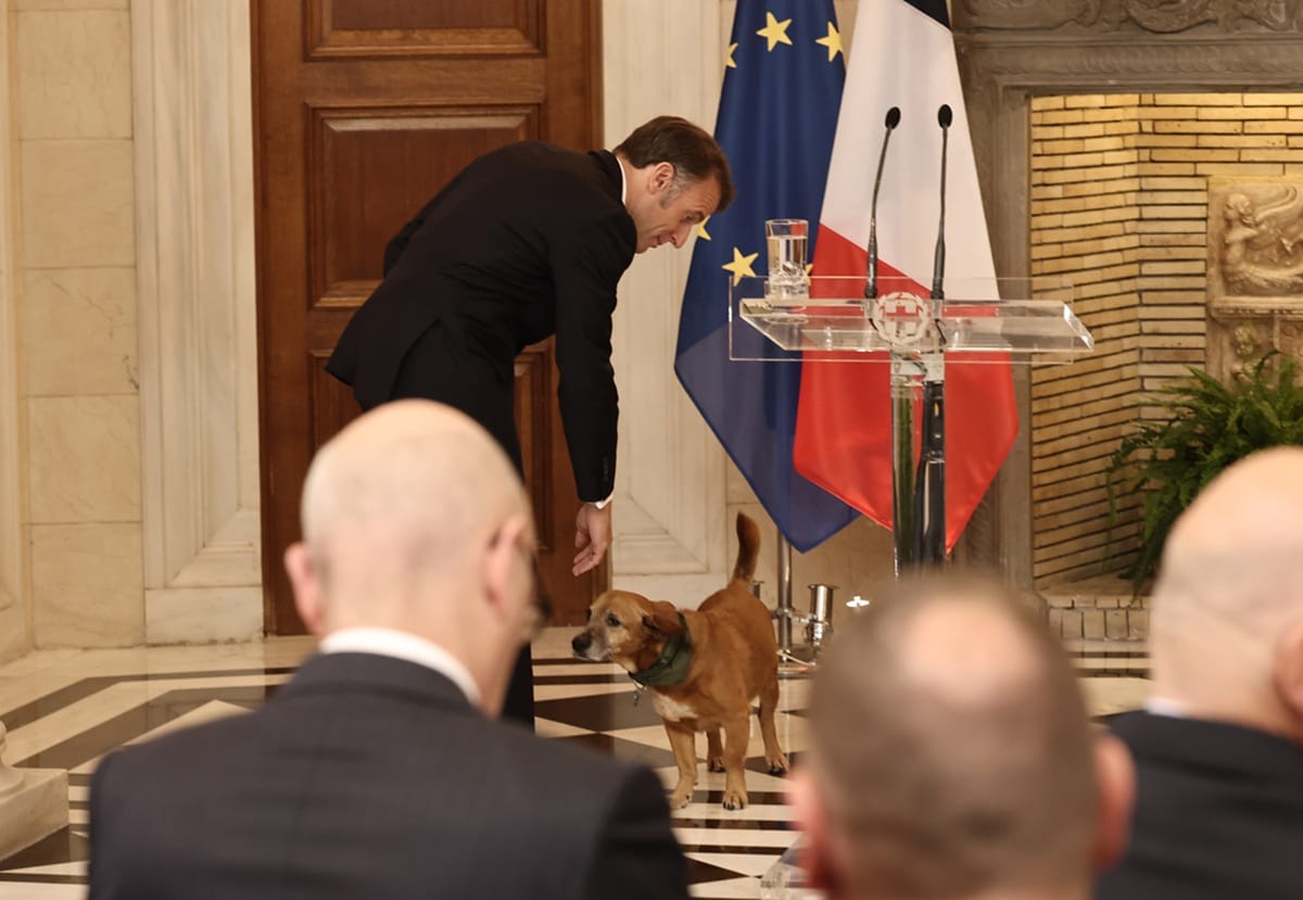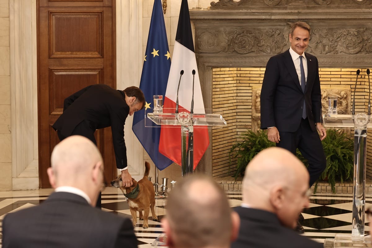 Ο Εμανουέλ Μακρόν γνώρισε τον Πίνατ – Φωτογραφίες από τα χάδια και τα παιχνίδια με τον σκύλο του Κυριάκου Μητσοτάκη