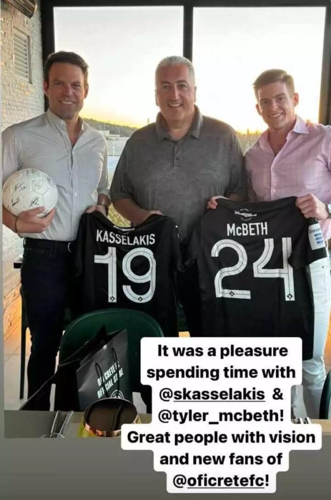 Στέφανος Κασσελάκης και Τάιλερ Μακμπέθ συναντήθηκαν με τον ιδιοκτήτη του ΟΦΗ και πήραν από μια φανέλα με τα ονόματά τους