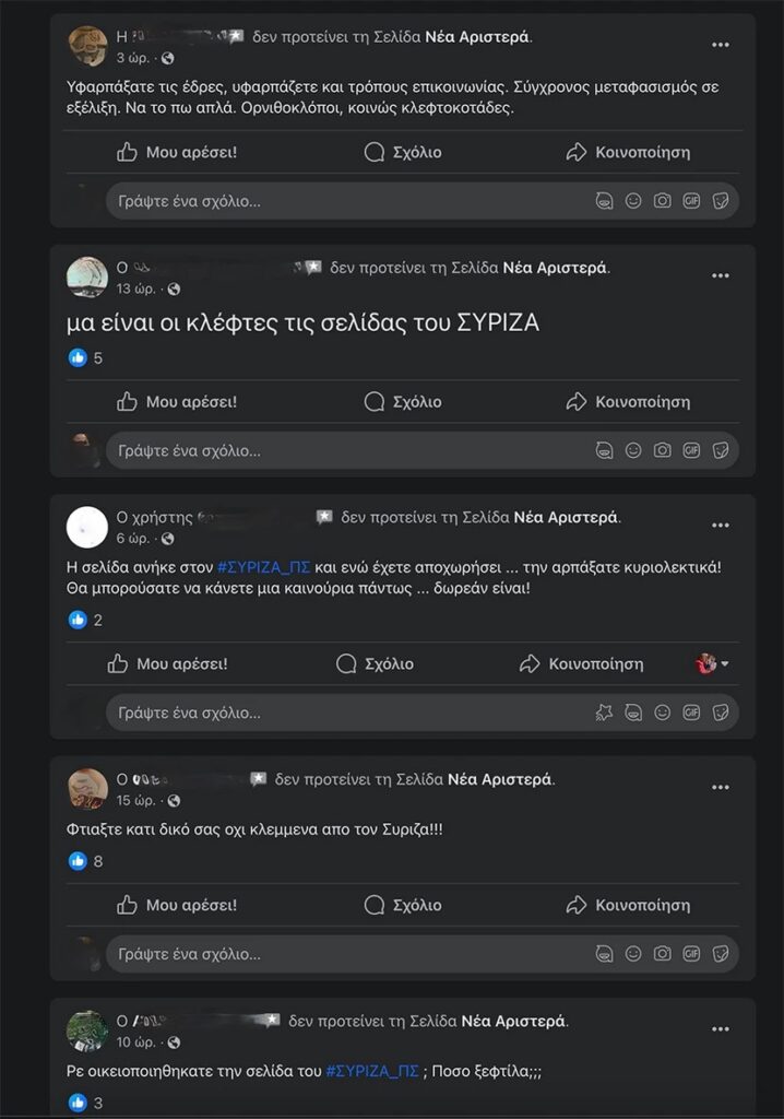 «Υφαρπάξατε τις έδρες, υφαρπάζετε και τους τρόπους επικοινωνίας. Σύγχρονος μεταφασισμός σε εξέλιξη. Να το πω απλά. Ορνιθοκλόποι, κοινώς κλεφτοκοτάδες» γράφει μια επισκέπτρια της σελίδας ενώ ένας άλλος παροτρύνει: «Φτιάξτε κάτι δικό σας, όχι κλεμμένα από τον Σύριζα» ή «Ρε οικειοποιηθήκατε τη σελίδα του ΣΥΡΙΖΑ – Προοδευτική Συμμαχία; Πόση ξεφτίλα;».