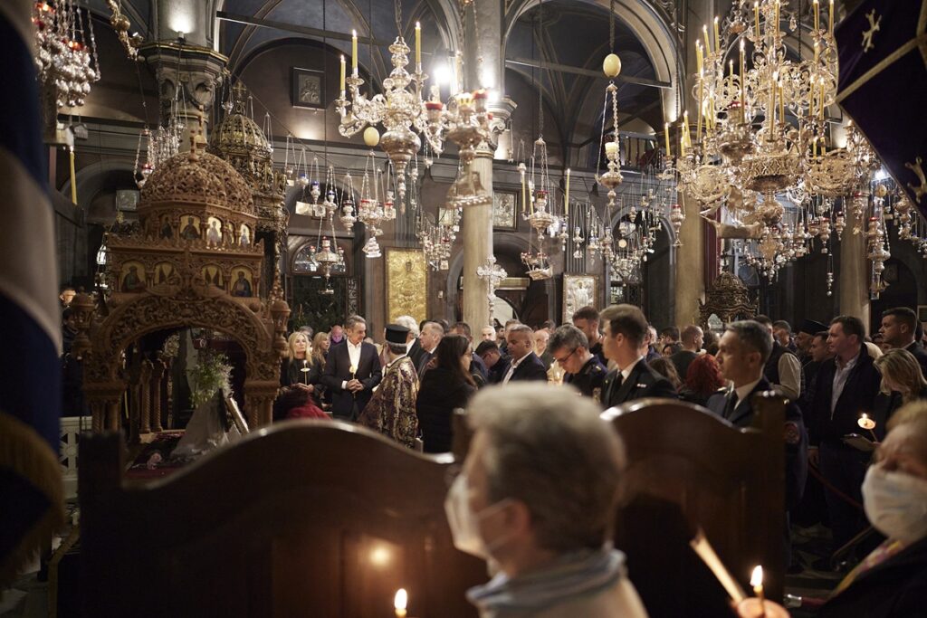 Ο Πρωθυπουργός Κυριάκος Μητσοτάκης, συνοδευόμενος από τη σύζυγό του Μαρέβα Γκραμπόφσκι – Μητσοτάκη, παρακολούθησε την Ακολουθία και Περιφορά του Επιταφίου στον Ιερό Ναό Ευαγγελιστρίας Τήνου.