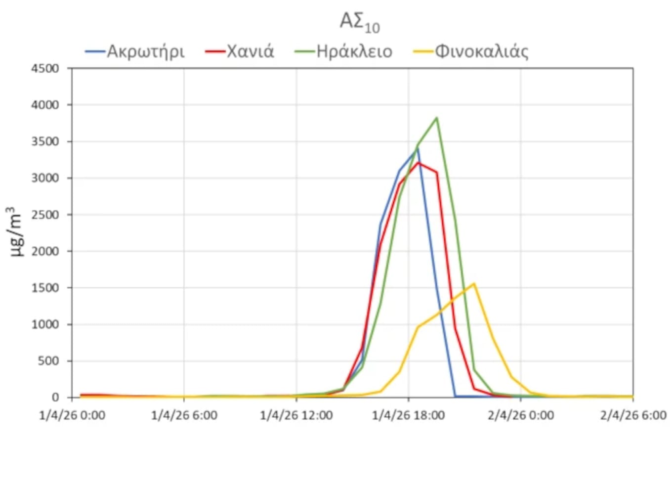 Η εξέλιξη του φαινομένου καταγράφηκε σε πραγματικό χρόνο από τέσσερις σταθμούς του Δικτύου ΣΧΕΔΙΑ Κρήτης, οι οποίοι μετρούν το σωματιδιακό φορτίο ΑΣ10 σε Χανιά, Ακρωτήρι Χανίων, Ηράκλειο και Φινοκαλιά.
