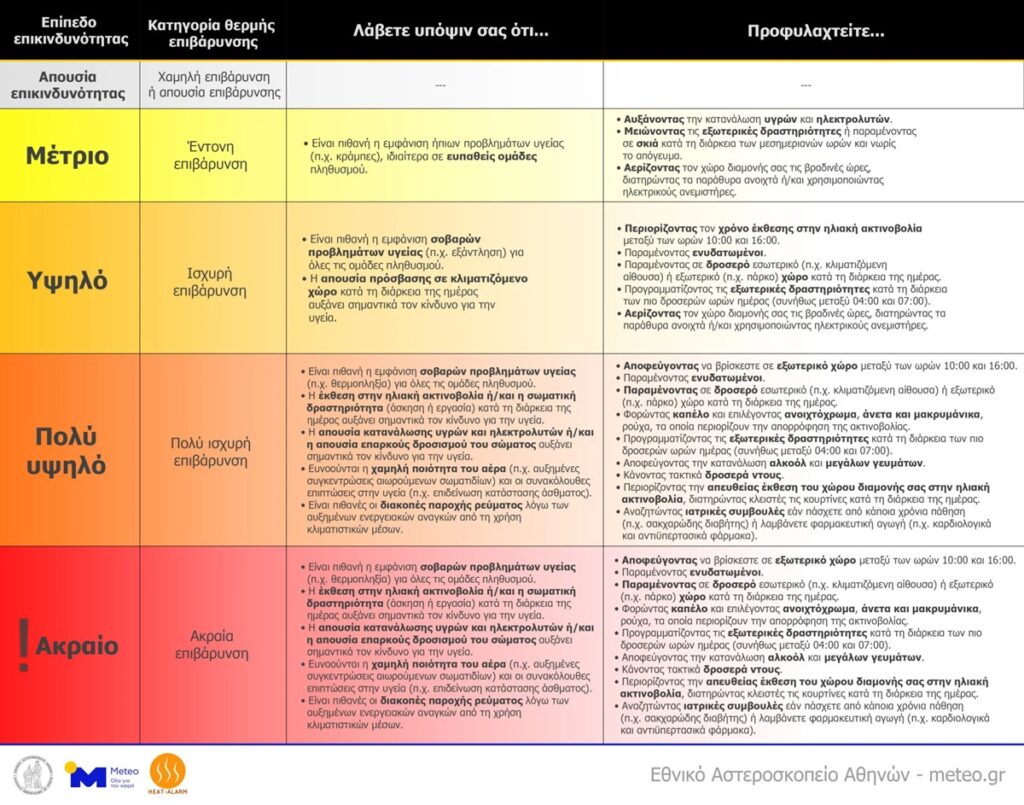 Όπως αναφέρει το Meteo, οι πολύ υψηλές θερμοκρασίες, όπως αυτές που επηρεάζουν τη χώρα μας από τις αρχές της εβδομάδας, αποτελούν σημαντική απειλή για την ανθρώπινη υγεία λόγω της θερμής επιβάρυνσης που προκαλείται στον ανθρώπινο οργανισμό. Ο βαθμός και η επικινδυνότητα αυτής της επιβάρυνσης εξαρτάται, πέρα από την θερμοκρασία, από την υγρασία, τον άνεμο, και την ακτινοβολία περιβάλλοντος, αλλά και από προσωπικές παραμέτρους (φύλο, ηλικία, βάρος, ύψος, επίπεδο ένδυσης και σωματικής δραστηριότητας). Λαμβάνοντας υπόψη όλους τους σχετικούς παράγοντες, το βιομετεωρολογικό σύστημα προειδοποίησης HEAT-ALARM εκδίδει προειδοποιήσεις σε κάθε περιφερειακή ενότητα της χώρας για ημέρες κατά τις οποίες η θερμή επιβάρυνση μπορεί να οδηγήσει σε σοβαρά προβλήματα υγείας.