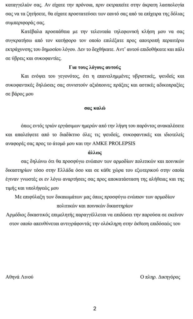 Ειδικότερα, η κα Λινού στο εξώδικο τον κατηγορεί για ψευδείς κατηγορίες εις βάρος της στις οποίες προέβη, ο ανεξάρτητος πλέον, βουλευτής Χανίων λόγω της αποπομπής του από την Κοινοβουλευτική Ομάδα του ΣΥΡΙΖΑ.