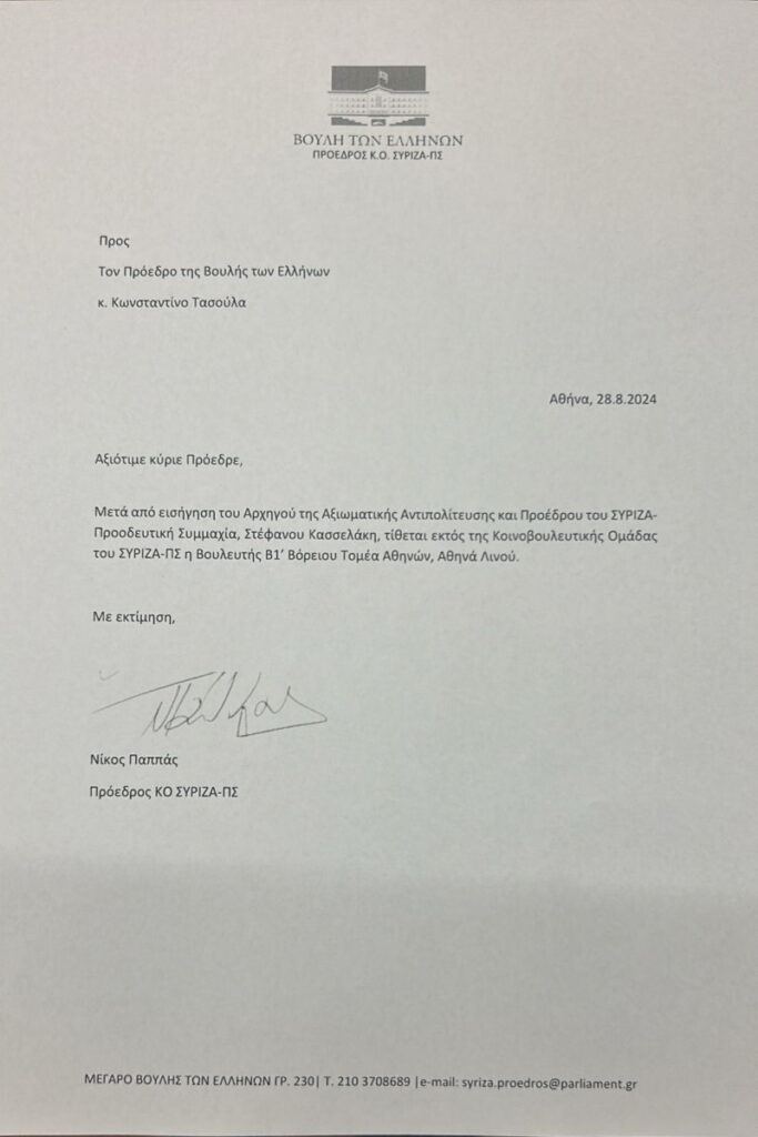 Λίγο πριν τις 6 το απόγευμα ο Νίκος Παππάς συνέταξε την επιστολή διαγραφής της Αθηνάς Λινού, την οποία και κοινοποίησε επισήμως στον πρόεδρο της Βουλής, Κωνσταντίνο Τασούλα.