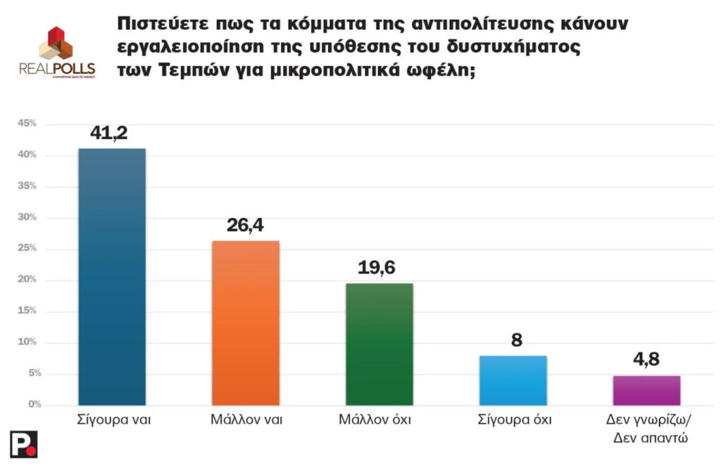 Στην ίδια δημοσκόπηση καταγράφεται, επίσης, ότι το 67,6% των ερωτηθέντων θεωρεί ότι κόμματα της αντιπολίτευσης εργαλειοποιούν την υπόθεση του δυστυχήματος στα Τέμπη για μικροπολιτικά οφέλη με ένα 27,6% να έχει αντίθετη άποψη.