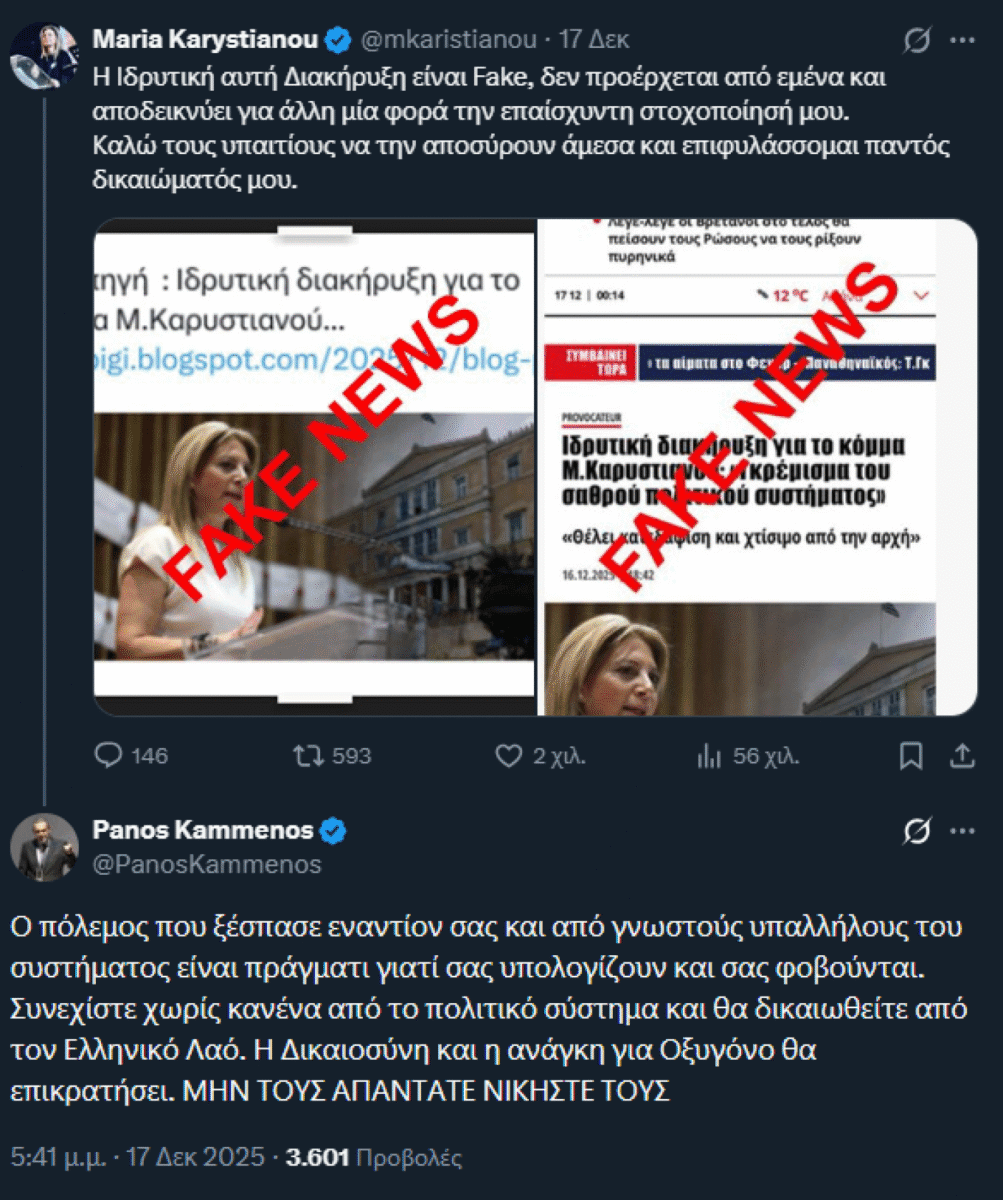 Η κ. Καρυστιανού είχε γράψει στο Twitter: «Η Ιδρυτική αυτή Διακήρυξη είναι Fake, δεν προέρχεται από εμένα και αποδεικνύει για άλλη μία φορά την επαίσχυντη στοχοποίησή μου. Καλώ τους υπαιτίους να την αποσύρουν άμεσα και επιφυλάσσομαι παντός δικαιώματός μου».