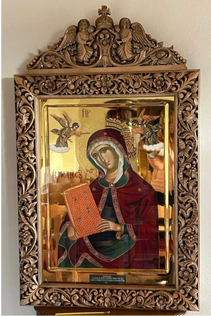 Η επιλογή της συγκεκριμένης εικόνας δεν ήταν τυχαία. Κατά την καταστροφική πυρκαγιά του 2019 που κατέκαψε τον ναό, διασώθηκαν περίπου 200.000 μέλισσες, οι οποίες είχαν τις κυψέλες τους στην οροφή του κτιρίου. Το γεγονός αυτό αποτέλεσε έμπνευση για τον Ιερομόναχο Γεώργιο Αλευρά, Προϊστάμενο της Ερημητικής Σκήτης των Καυσοκαλυβίων στο Άγιο Όρος, ο οποίος διέταξε τη δημιουργία ενός αντιγράφου της εικόνας της Παναγίας της Μελισσούς, ενός αριστουργήματος βυζαντινής αγιογραφίας. Η εικόνα δημιουργήθηκε με την υποστήριξη της Ομοσπονδίας Ελληνικών Μελισσοκομικών Συλλόγων και άλλων οργανισμών.