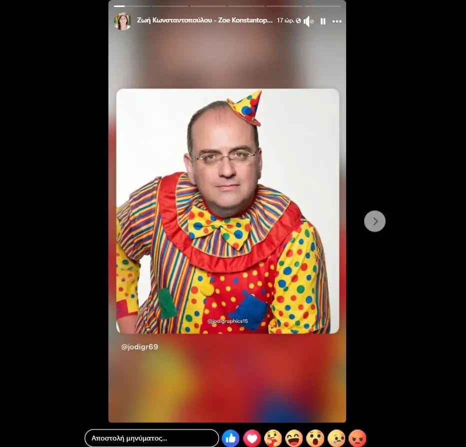 Story της Ζωής Κωνσταντοπούλου με τον Μακάριο Λαζαρίδη ντυμένο κλόουν: “Η ΝΔ πέφτει σε αυτό το επίπεδο του λαγουμιού, κύριε γυμνοσάλιαγκα”