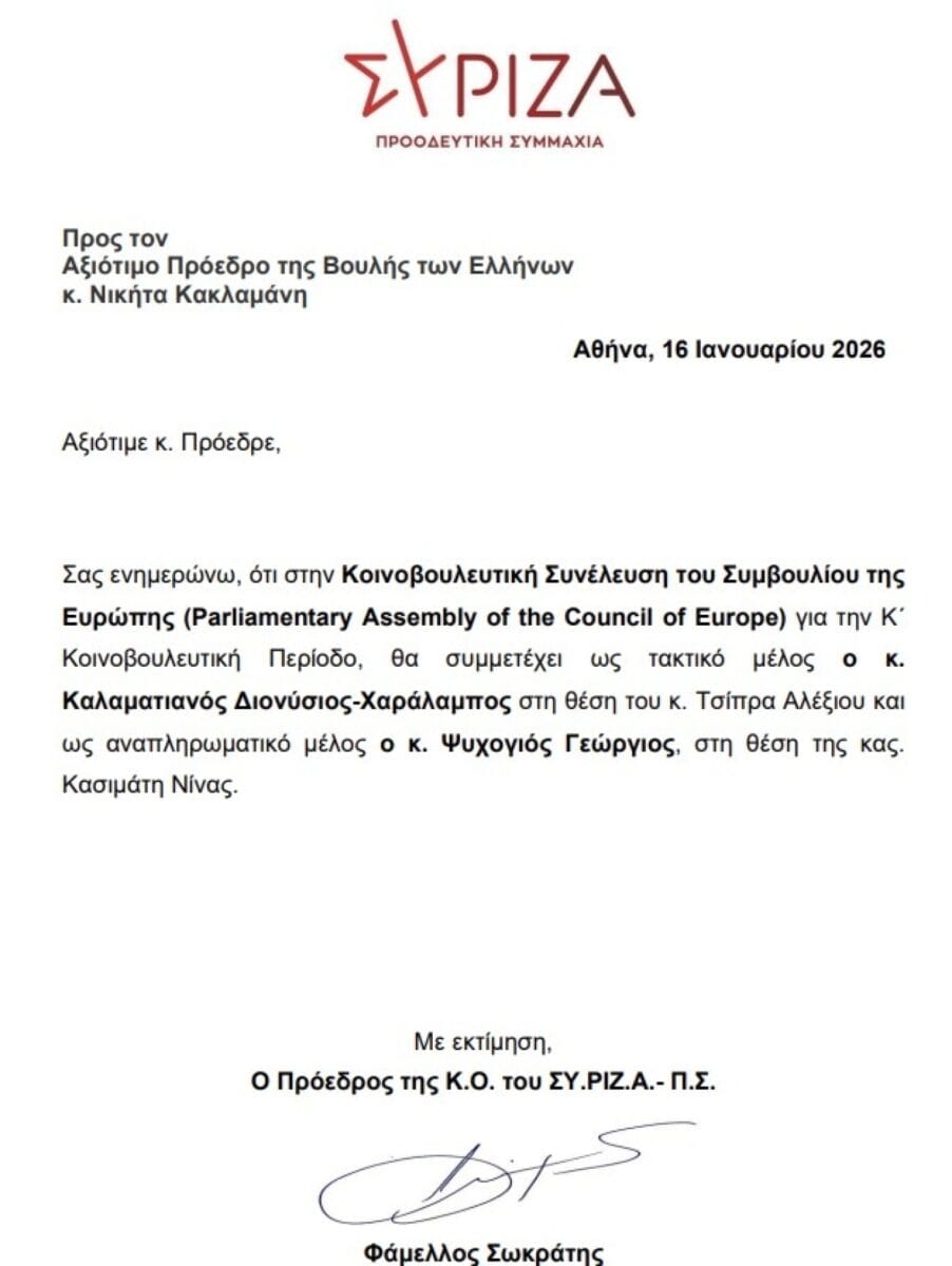 Με επιστολή του προς τον Πρόεδρο της Βουλής, Νικήτα Κακλαμάνη, ο κ. Φάμελλος ανακοίνωσε ότι στην Κοινοβουλευτική Συνέλευση του Συμβουλίου της Ευρώπης (Parliamentary Assembly of the Council of Europe), για την Κ΄ Κοινοβουλευτική Περίοδο, ως τακτικό μέλος θα μετέχει ο Διονύσης Καλαματιανός και ως αναπληρωματικό ο Γιώργος Ψυχογιός. Μέχρι σήμερα, εκπρόσωπος του ΣΥΡΙΖΑ ήταν ο Αλέξης Τσίπρας, που έχει παραιτηθεί από τη βουλευτική του έδρα και αναπληρωματικό μέλος η κυρία Κασιμάτη.