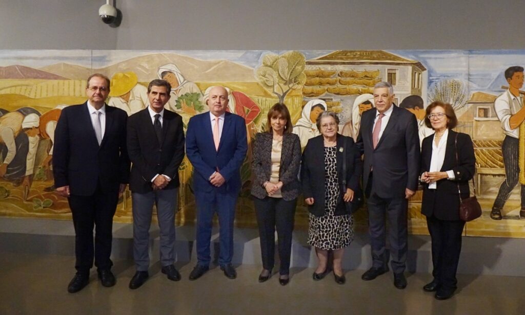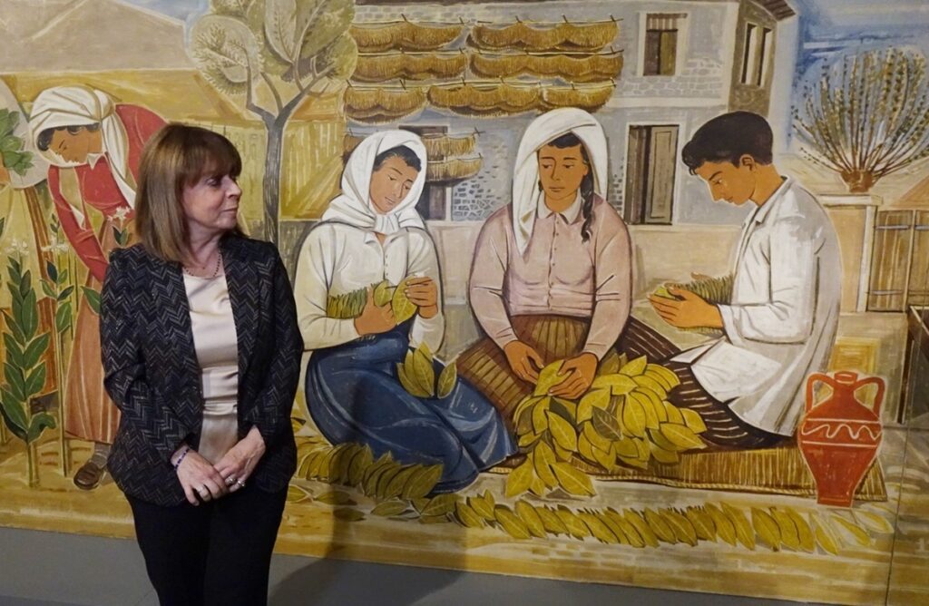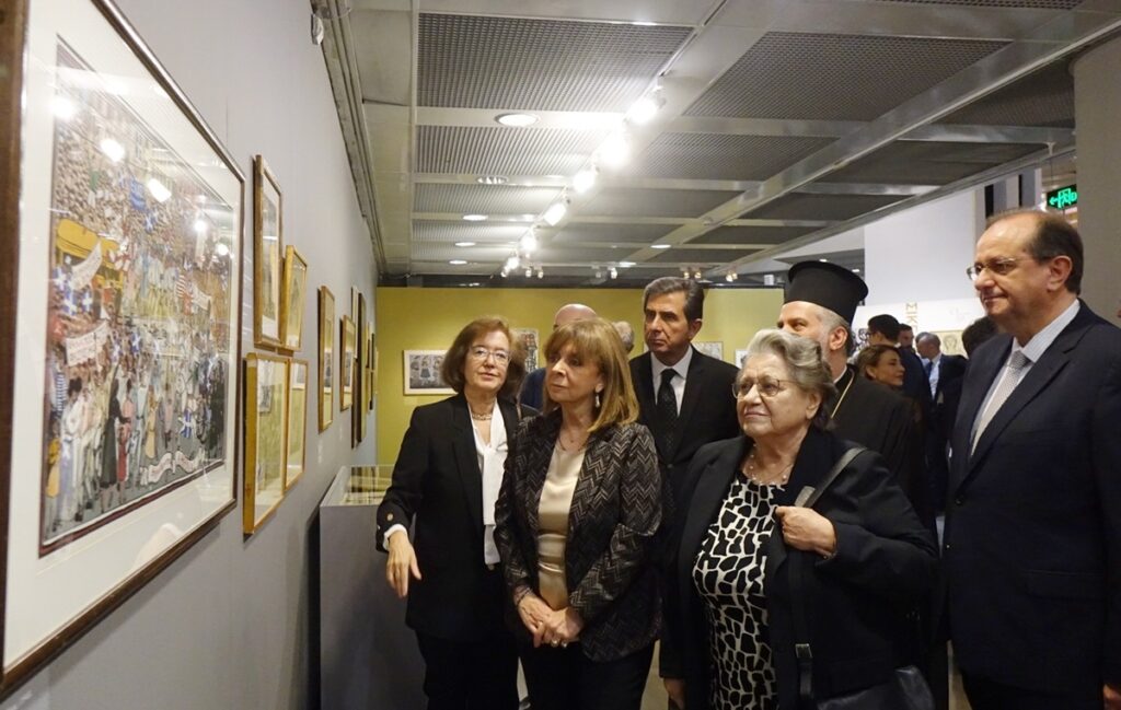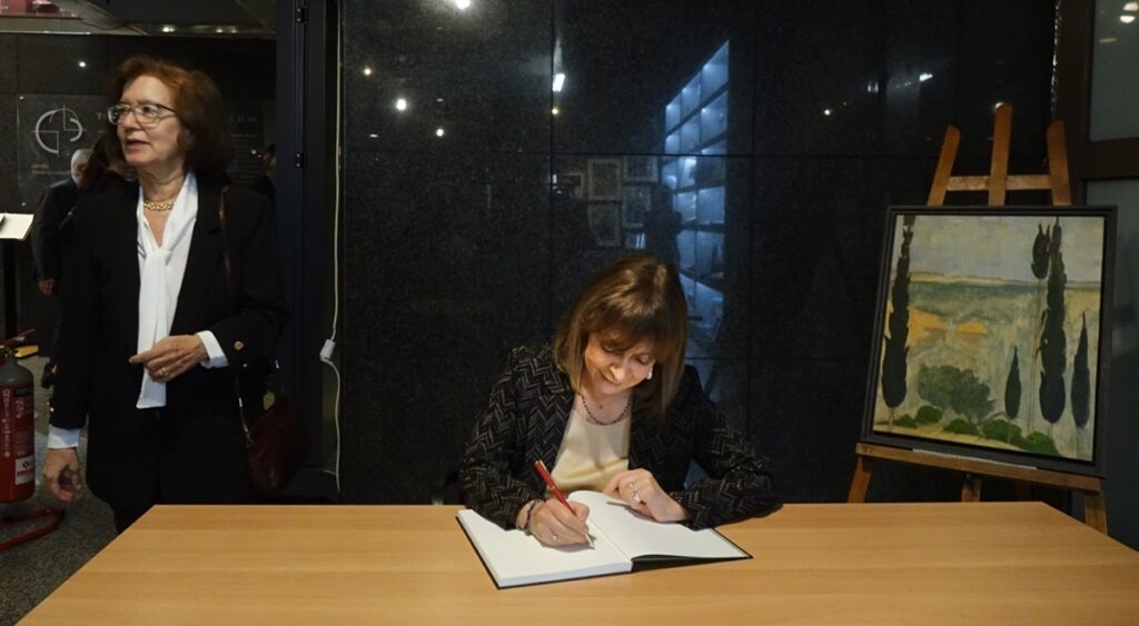 Μετά τους χαιρετισμούς στο αμφιθέατρο του Τελλογλείου ακολούθησε περιήγηση στην έκθεση στην Πρόεδρο της Δημοκρατίας και τους επισκέπτες από την Γενική Διευθύντρια του Τελλογλείου Ιδρύματος.