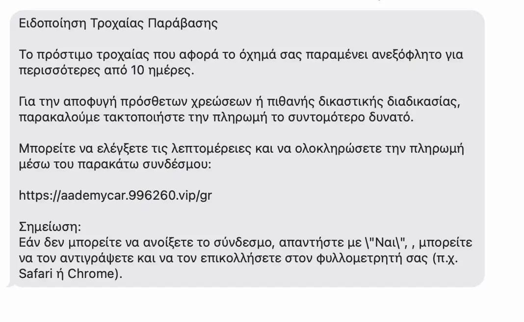 Αναφορές από πολίτες και υπηρεσίες δείχνουν τελευταία αύξηση στην αποστολή παραπλανητικών μηνυμάτων SMS, τα οποία ενημερώνουν ψευδώς για ανεξόφλητα πρόστιμα τροχαίας και καλούν τον παραλήπτη να επισκεφθεί σύνδεσμο για λεπτομέρειες ή άμεση πληρωμή.