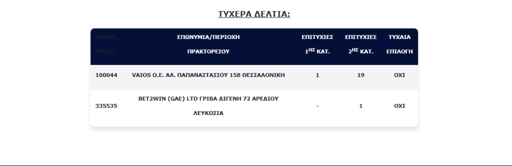 Στο ίδιο πρακτορείο μάλιστα βρέθηκαν 19 τυχερά δελτία βρέθηκαν στη 2η κατηγορία (5), τα οποία κερδίζουν το ποσό των €100.000,00 για κάθε επιτυχία.