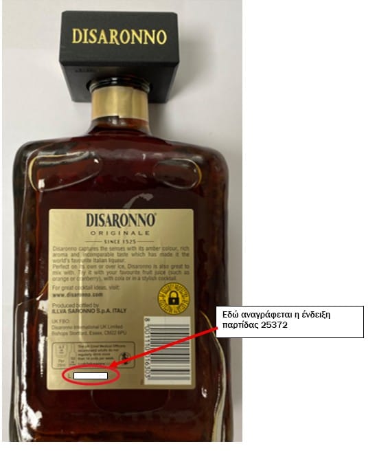 Στην ανάκληση συγκεκριμένης παρτίδας του λικέρ “Disaronno” προχωρά η Γενική Διεύθυνση του Γενικού Χημείου του Κράτους (ΓΔ ΓΧΚ) της ΑΑΔΕ, σε συνέχεια ενημέρωσης που έλαβε από εταιρεία διακίνησης αλκοολούχων ποτών σχετικά με την πιθανή παρουσία θραυσμάτων γυαλιού.